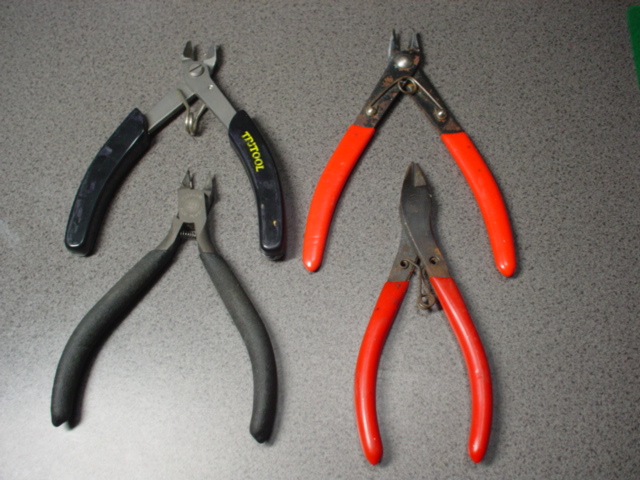 2007-02-27 「工具」NO2 飛行機模型 1,「ニッパー」 左上がエッチングニッパー、下が小型ゲートニッパー(一番使用頻度の多い工具で模型を作るのには欠かせません)、右上が汎用ニッパー、下が予備用 2,「テンプレート」 ホイールを塗装する時などに使うと大変便利です 3,「マスキングテープ」 右上が30ミリ、下がケース入り15ミリを半分にカットして使用、左上が15ミリ、下がケース入り5ミリ、真ん中が1ミリ、(エンジンカウリング等の曲線塗り分け時のマスキングなどに使用、ハセのマローダにも使いました)