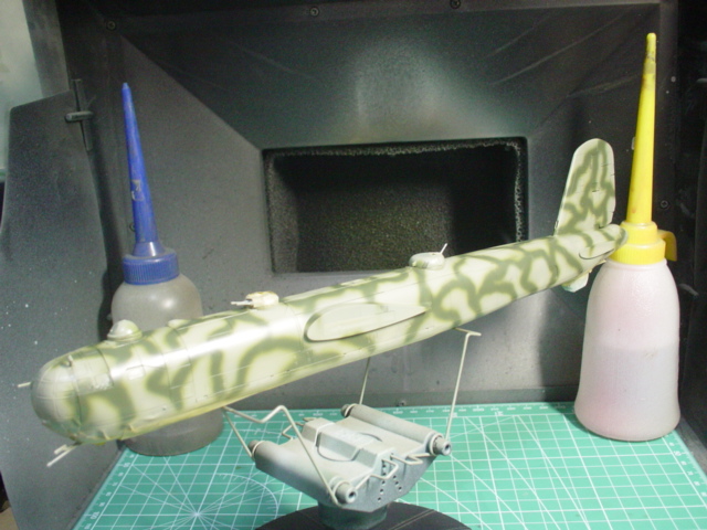 2009-04-09 迷彩ライン塗装・「ハインケルHe177A-5爆撃機 」 飛行機模型 んー、何とか塗装しましたが、難しい…。組み説の塗装図で下書きしたんですが、目が細かい…ボックスアートは目が粗い…何度かやり直して、中間をとった感じの仕上がりにしました。 模型作るのにも絵の才能が無いと難しいです。